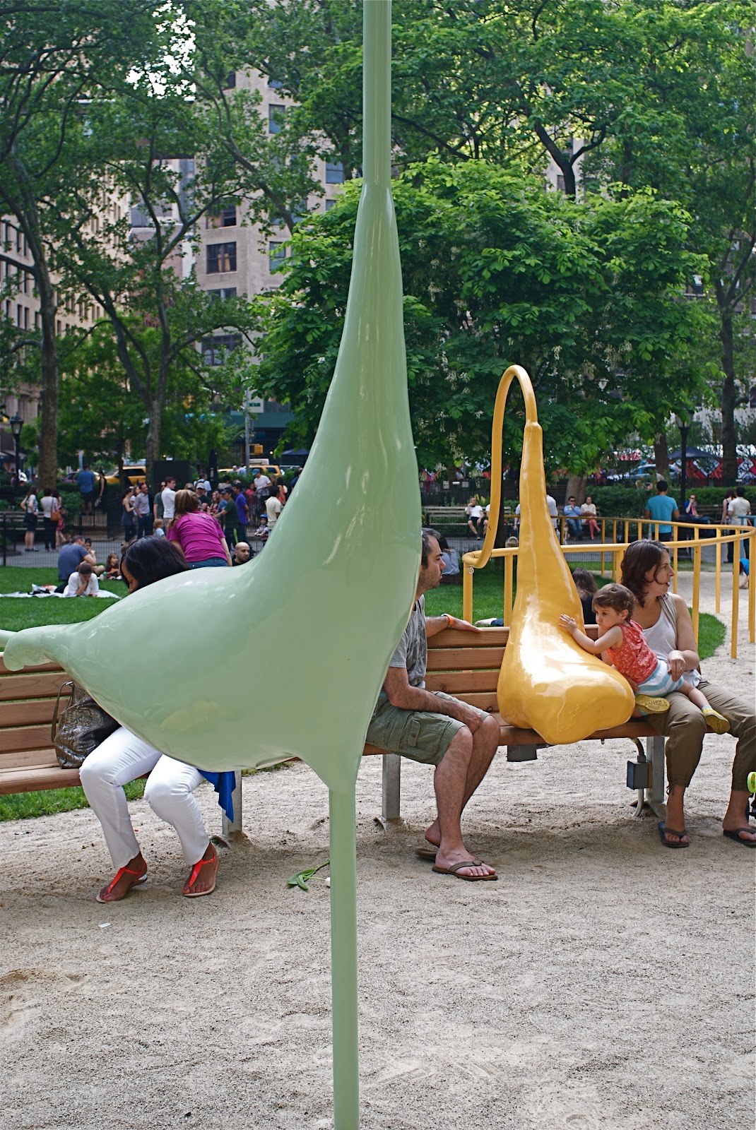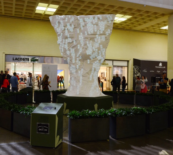 Long’s contribution to Nasher XChange is Fountainhead, a kind of digital fountain-cum-installation at NorthPark Center, a shopping mall six miles north of downtown Dallas. Fountainhead is an object onto which images of falling dollar bills are projected. The sculpture is surrounded by three digital kiosks, at which visitors to the mall are invited to swipe their credit cards and to donate $1, $3 or $5 to one of three charities: The North Texas Food Bank, a branch of the Dallas Library and the Dallas Court Appointed Special Advocates. After donating, visitors may ‘flip’ a digital coin into the fountain, which responds with an exuberant animation.