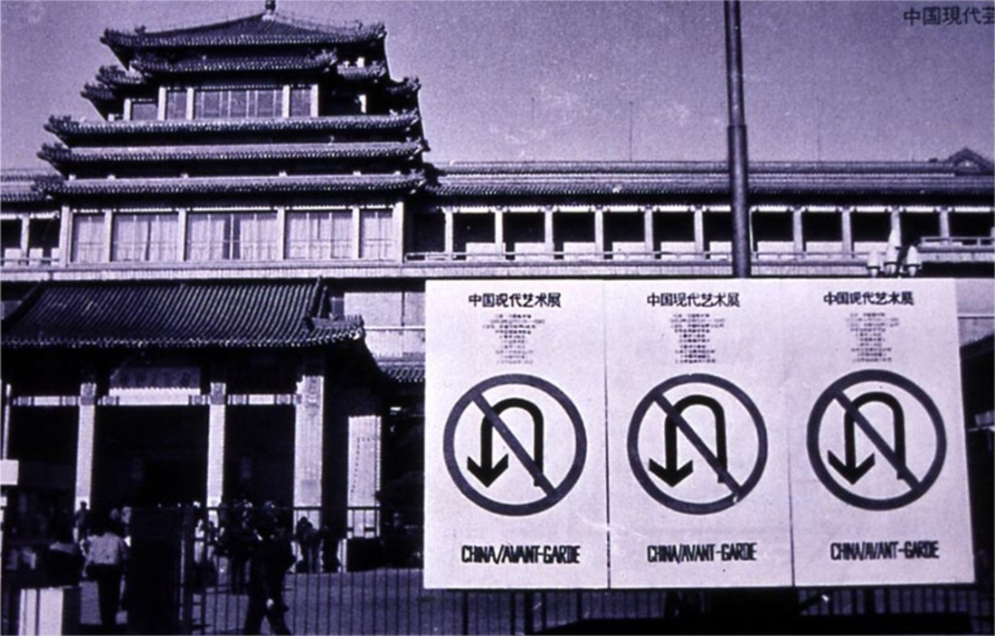Exterior view: National Art Gallery Beijing, with exhibition posters for China/Avant Garde, February 1989.