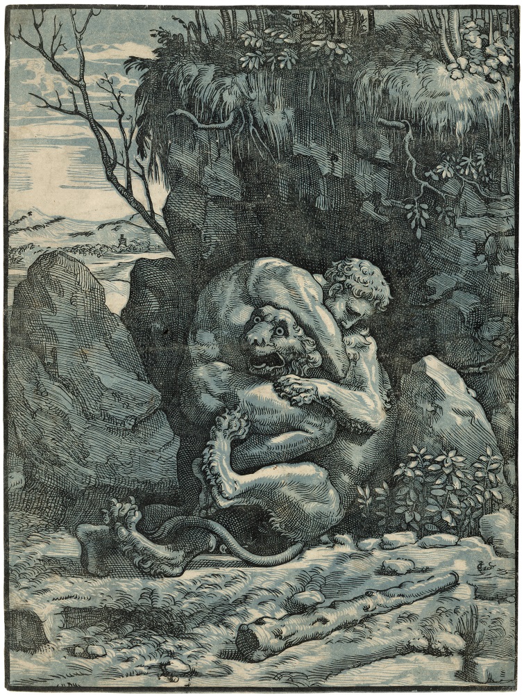 Ugo da Carpi after Raphael or Giulio Romano, Hercules and the Nemean Lion, c 1517-18.