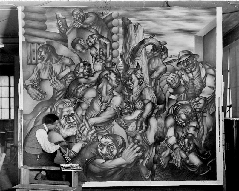 Charles White working on the left panel of Struggle for Liberation, 1940-41.