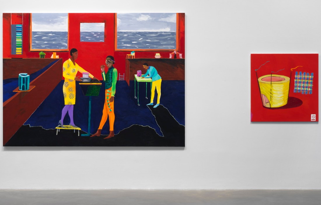 “Lubaina Himid: Work from Underneath,” 2019. Exhibition view at the New Museum, New York. At left: Himid, Three Architects, 2019. At right: Himid, Close Up — Ideas for Development, 2019.