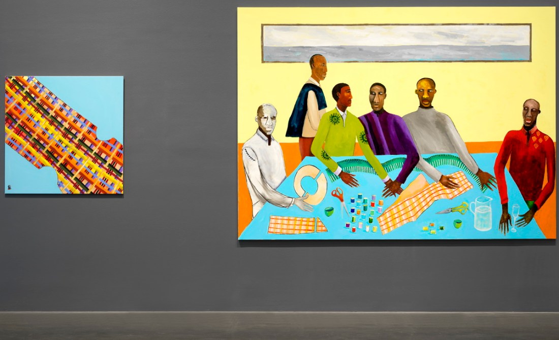 “Lubaina Himid Work from Underneath,” 2019. Exhibition view at the New Museum, New York. At left: Himid, Close Up — Materials for Change, 2019. At right: Himid, Six Tailors, 2019.