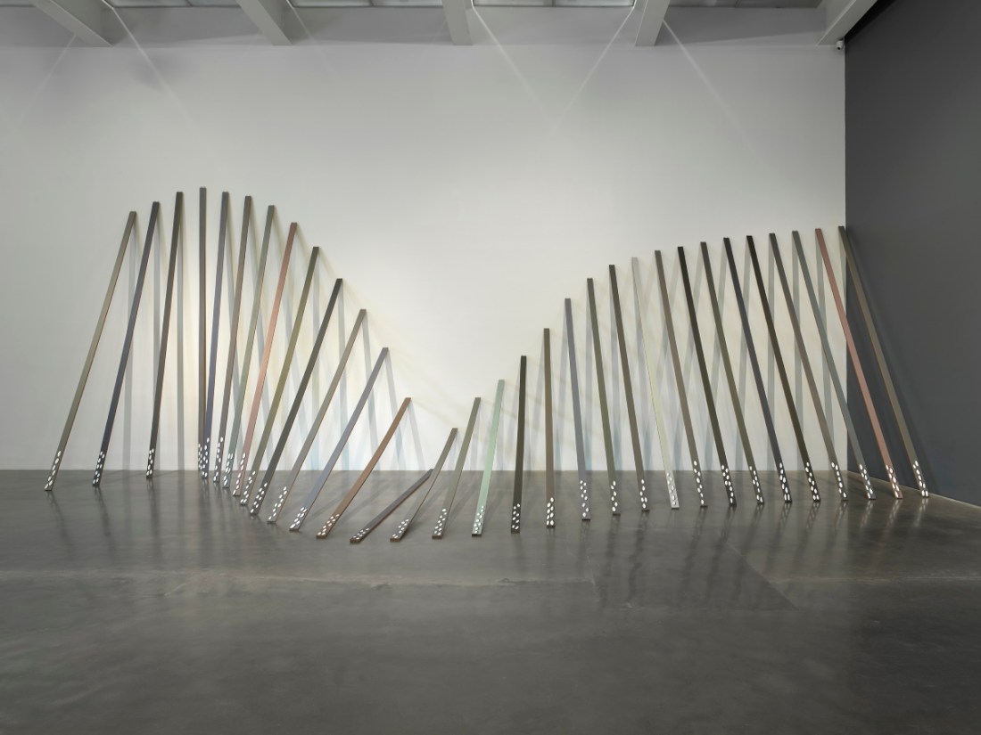 “Lubaina Himid Work from Underneath,” 2019. Exhibition view at the New Museum, New York. At left: Himid, Metal Handkerchief – Hammer / Anchor, 2019. At right: Himid, Metal Handkerchief – Saw / Flag, 2019.