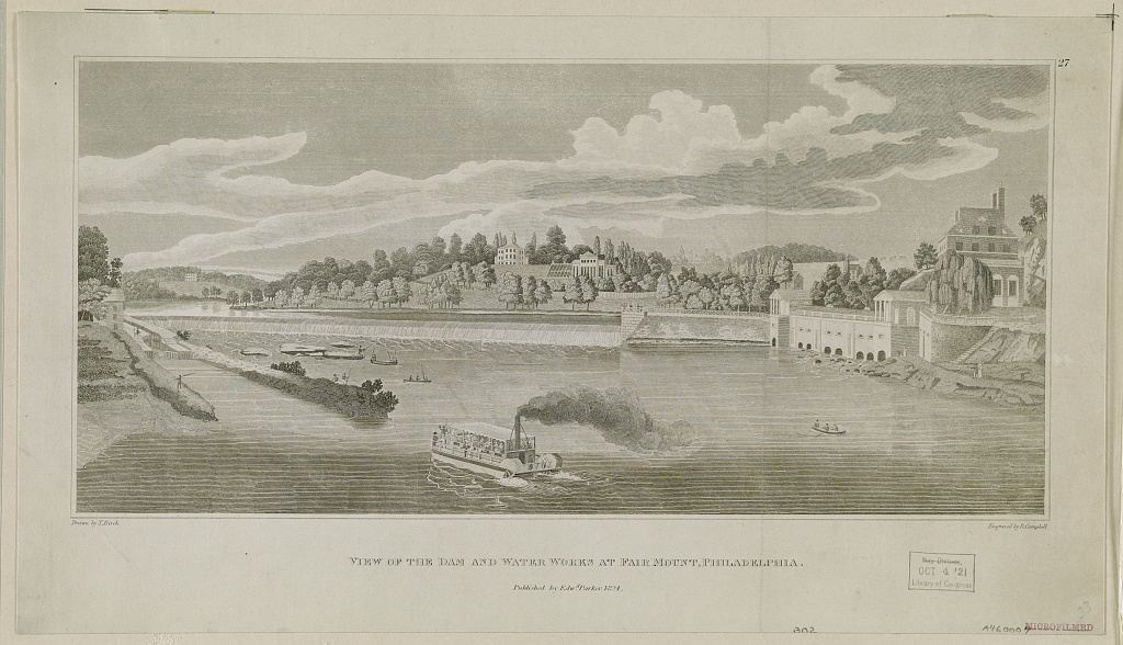 Robert Campbell after Thomas Birch, View of the Dam and Waterworks at Fairmount, Philadelphia, 1824.