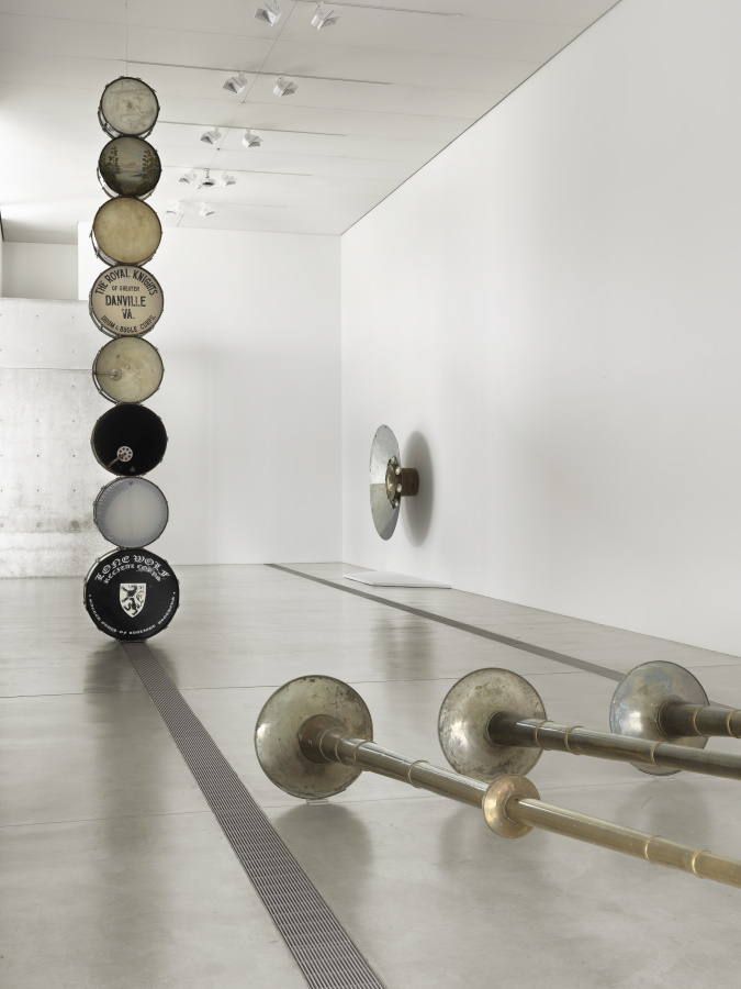 Terry Adkins, Divine Mute, 1998; Muffled Drumes, 2003 as installed at the Pulitzer Foundation for the Arts, St. Louis.