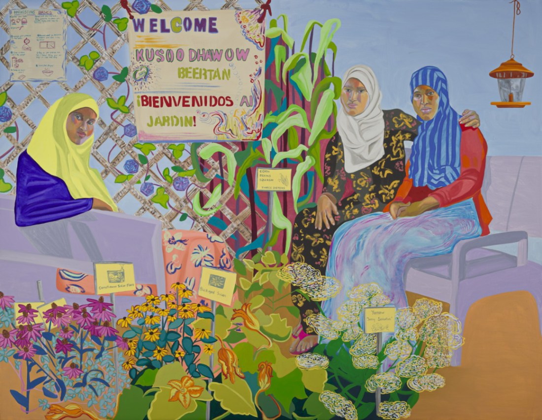 Aliza Nisenbaum, Nimo, Sumiya, and Bisharo harvesting flowers and vegetables at Hope Community Garden, 2017.