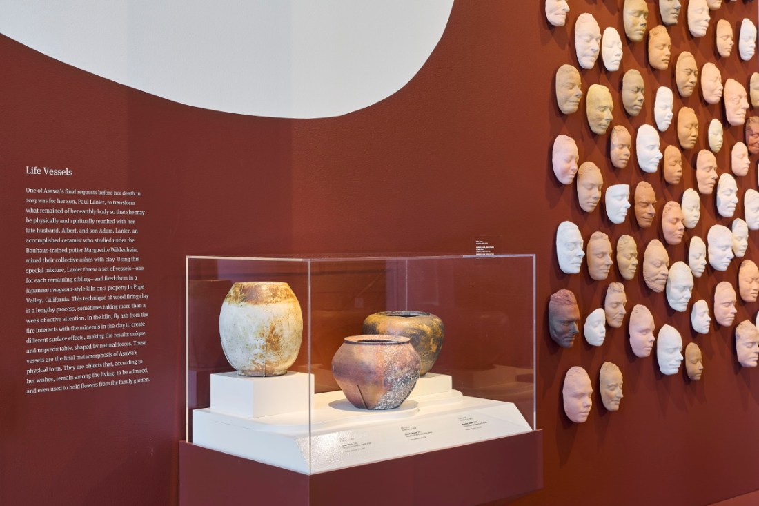 “Faces” also includes three vessels by Asawa’s son Paul Lanier. Each was made with clay mixed with the ashes of Asawa, her husband Albert, and their late son, Adam. Upon Asawa’s death, by her request, Lanier threw these materials into a set of vessels, one for each surviving sibling.