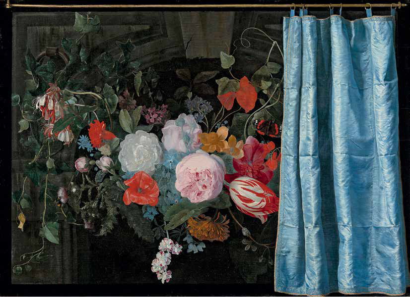 Adriaen van der Spelt and Frans van Mieris the Elder, Trompe l’Oeil Still Life with Flower Garland and Curtain, 1658.