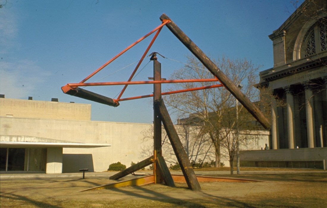 Installation of Mark di Suvero, Are Years What? (For Marianne Moore), 1967 in Sculpture Off the Pedestal, Grand Rapids (Mich.) Art Museum, 1973.