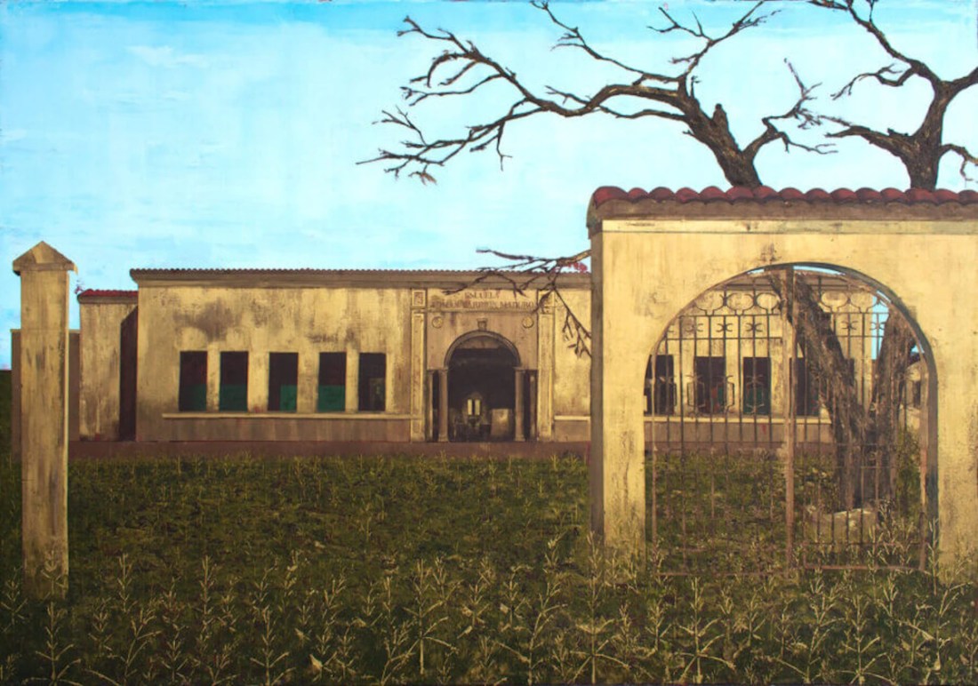 Báez Vega’s paintings often portray modernist buildings dating from Puerto Rico’s post-war boom. While his pictures sometimes show the island’s rich vegetation overtaking physical structures, they imply both a dystopian future and nature’s promise.