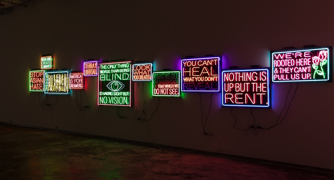 Dallas Contemporary is showing “Patrick Martinez: Histories” through September 1. The exhibition surveys work Martinez has made since 2016, including his Pee Chee folder-referencing paintings, cake paintings, neons, and his recent multi-media paintings which often feature stucco, paint, and neon. It was curated by Rafael Barrientos Martínez.