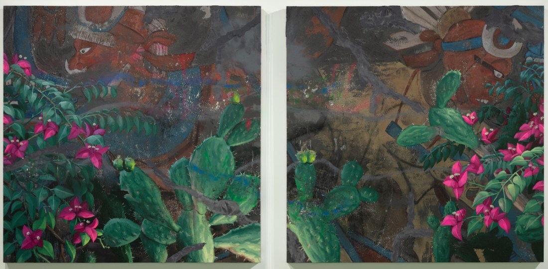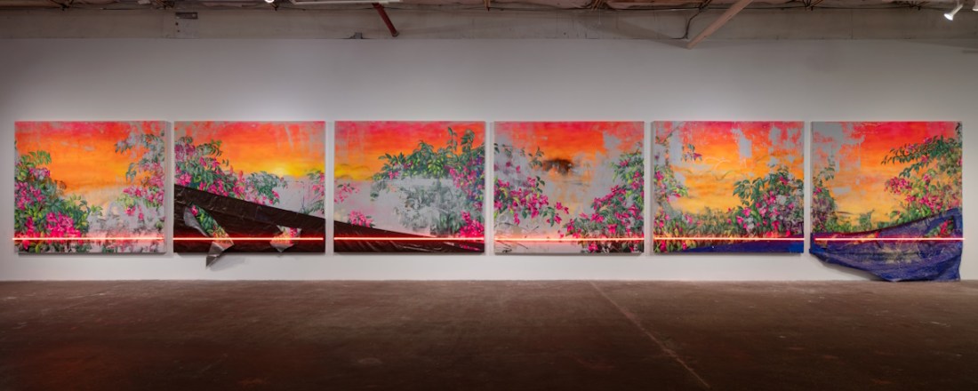 Installation view, Patrick Martinez, Fleeting Bougainvillea Landscape, 1-6, 2023, in “Patrick Martinez: Histories,” Dallas Contemporary.