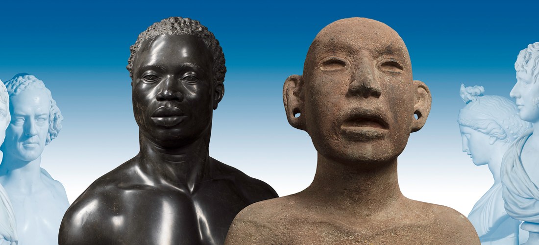 Composition in Black and Brown I (foreground: Yale Center for British Art, Francis Harwood, “Bust of a Man,” and Yale Peabody Museum, Central Mexico, “Young Man”; background, all Yale Center for British Art: William Brodie, “Alfred, Lord Tennyson, Poet Laureate”; John Gibson, “Aurora”; Joseph Nollekens, “Charles James Fox,” “Charlotte, fourth Duchess of Richmond,” and “Portrait of a Man, Probably Lord Granville Leveson-Gower”; John Nost III, “George III”; and Louis François Roubiliac, “Alexander Pope”), 2024.