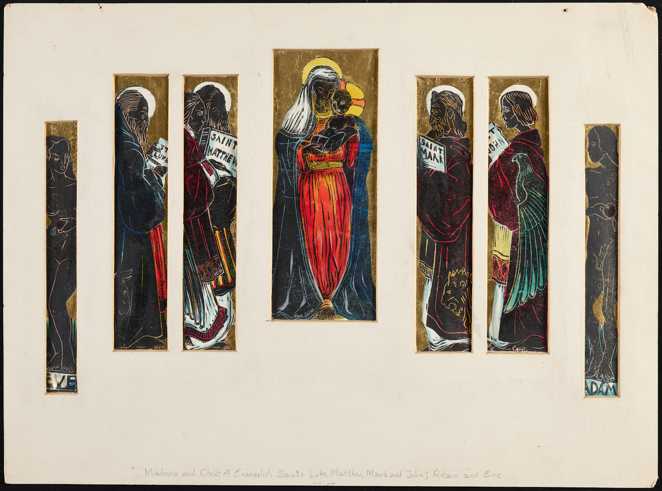 Allan Rohan Crite, Madonna and Child; 4 Evangelists Saints Luke, Matthew, Mark, and John; Adam and Eve, about 1934.