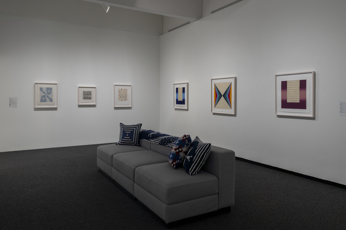 Installation view of an installation of Dyani White Hawk prints, Walker Art Center.