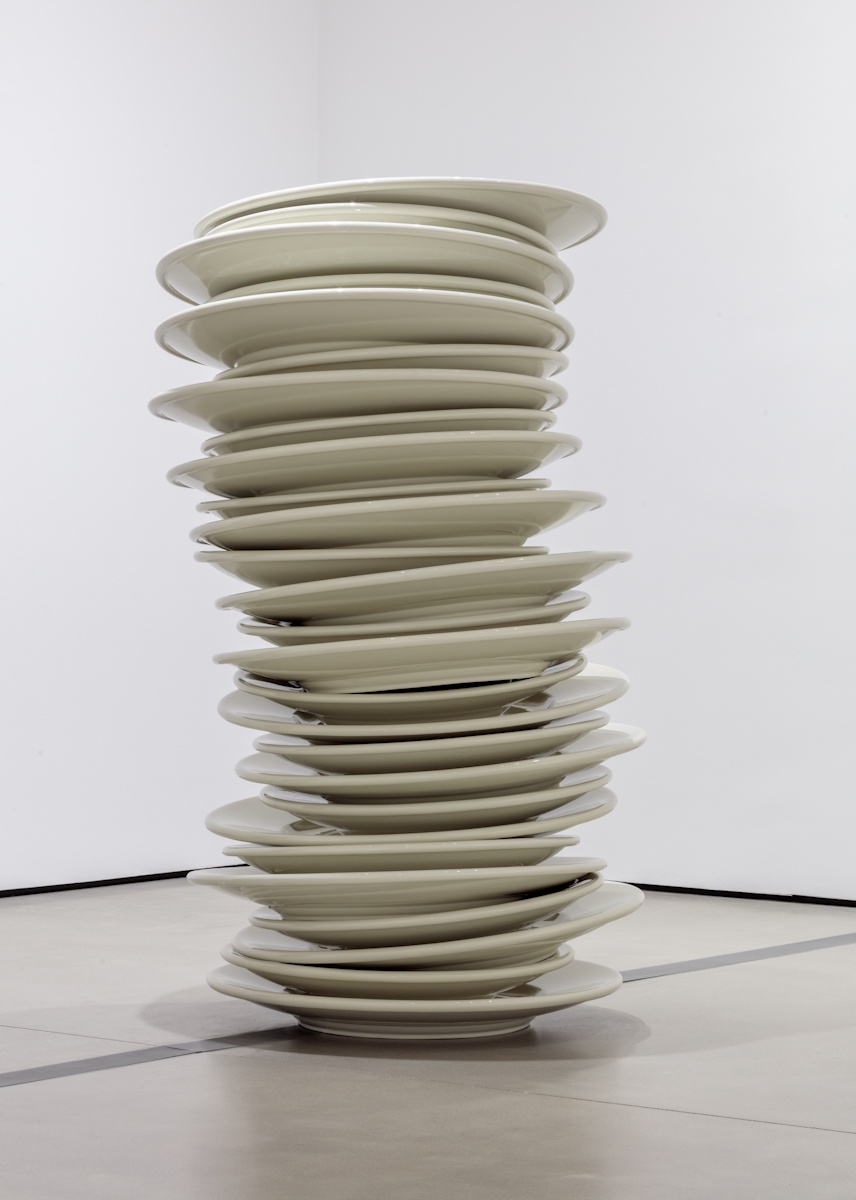 Installation view of Robert Therrien, No title (stacked plates, white), 1993.